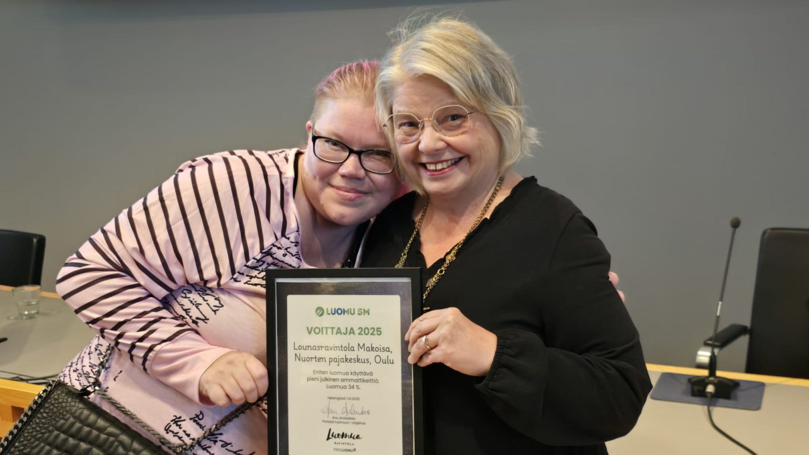 Terhi Maijala (vas.) ja Merja Pitkänen vastaanottivat Helsingissä Oulun Nuorten pajakeskuksen Makoisa-keittiön voittaman Luomu SM -kilpailun palkinnon. Kuva: Merja Jokiniemi