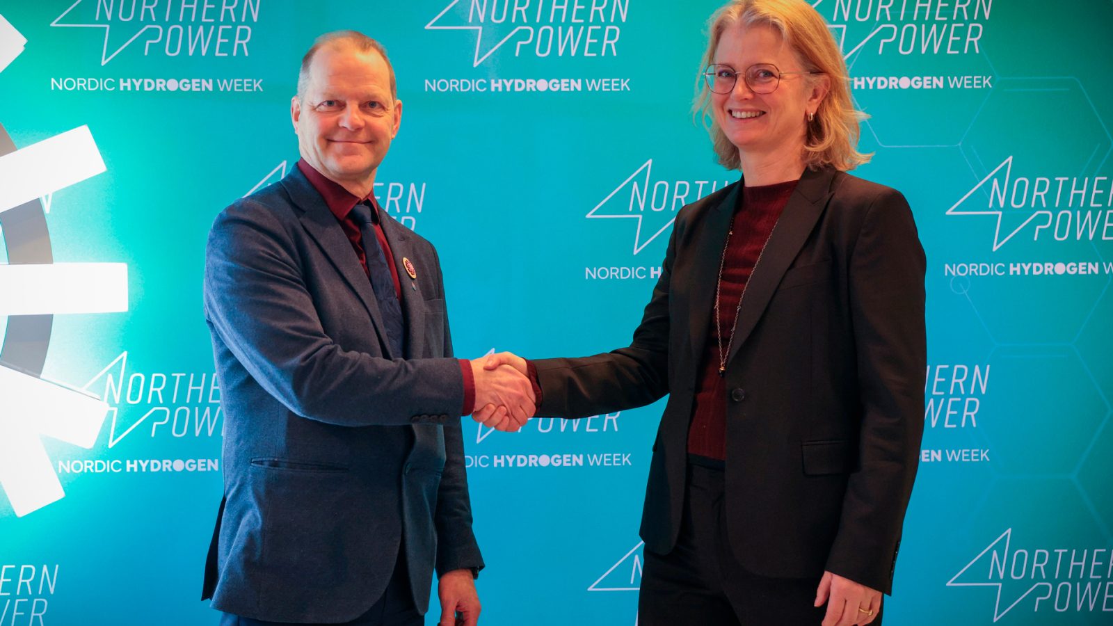 Oulun kaupunginjohtaja Ari Alatossava ja Hy2gen Nordic AS:n toimitusjohtaja Hege Økland kättelivät sopimuksen päätteeksi. Kuva: Jukka Vähälummukka