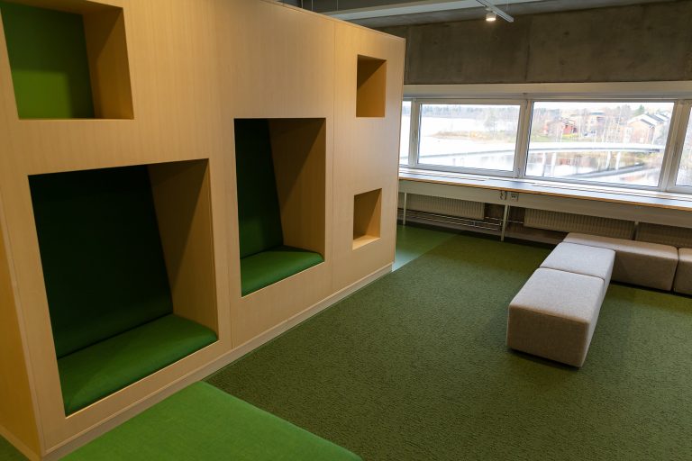 ”Ainesosina on käytännössä betoni, lasi, alumiini ja puu. Tämä on kokonaistaideteos, hyvin kurinalaisesti suunniteltu, mutta kuitenkin toiminnallisuus on äärimmäisen hyvä. Sitä todistaa sekin, että kirjasto halusi ehdottomasti jäädä tänne”, hankepäällikkö Pääkkönen toteaa.