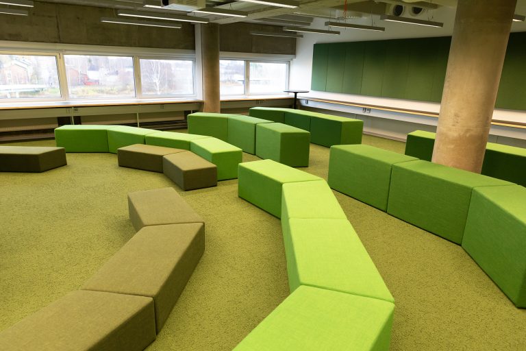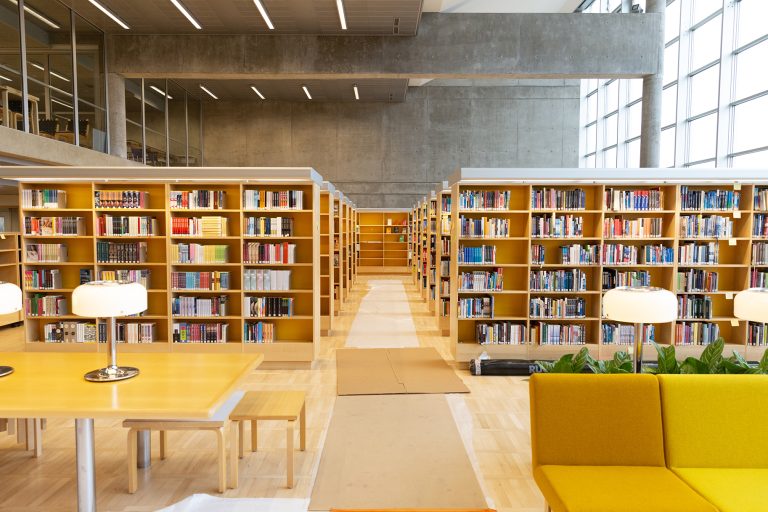 Kirjahyllyissä on käytetty hyväksi lähes kolmen kilometrin mitalta vanhoja, uudelleen viilutettuja hyllylevyjä, vaikka vanhat lastulevystä tehdyt hyllyrungot jouduttiin uusimaan. Vanhoja valaisimia on säilytetty ja kunnostettu, samoin Artekin ja Studio Nurmesniemen alkuperäistä sisustusta ja kalustusta.