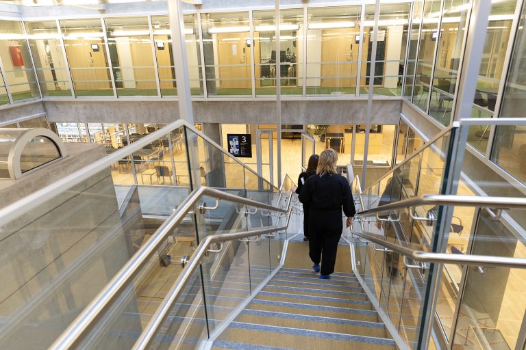 Kirjastorakennuksen arkkitehtuuria kiitellään muun muassa siitä, että porrashuoneesta avautuu hyvin näkymät kirjaston toimintaan.