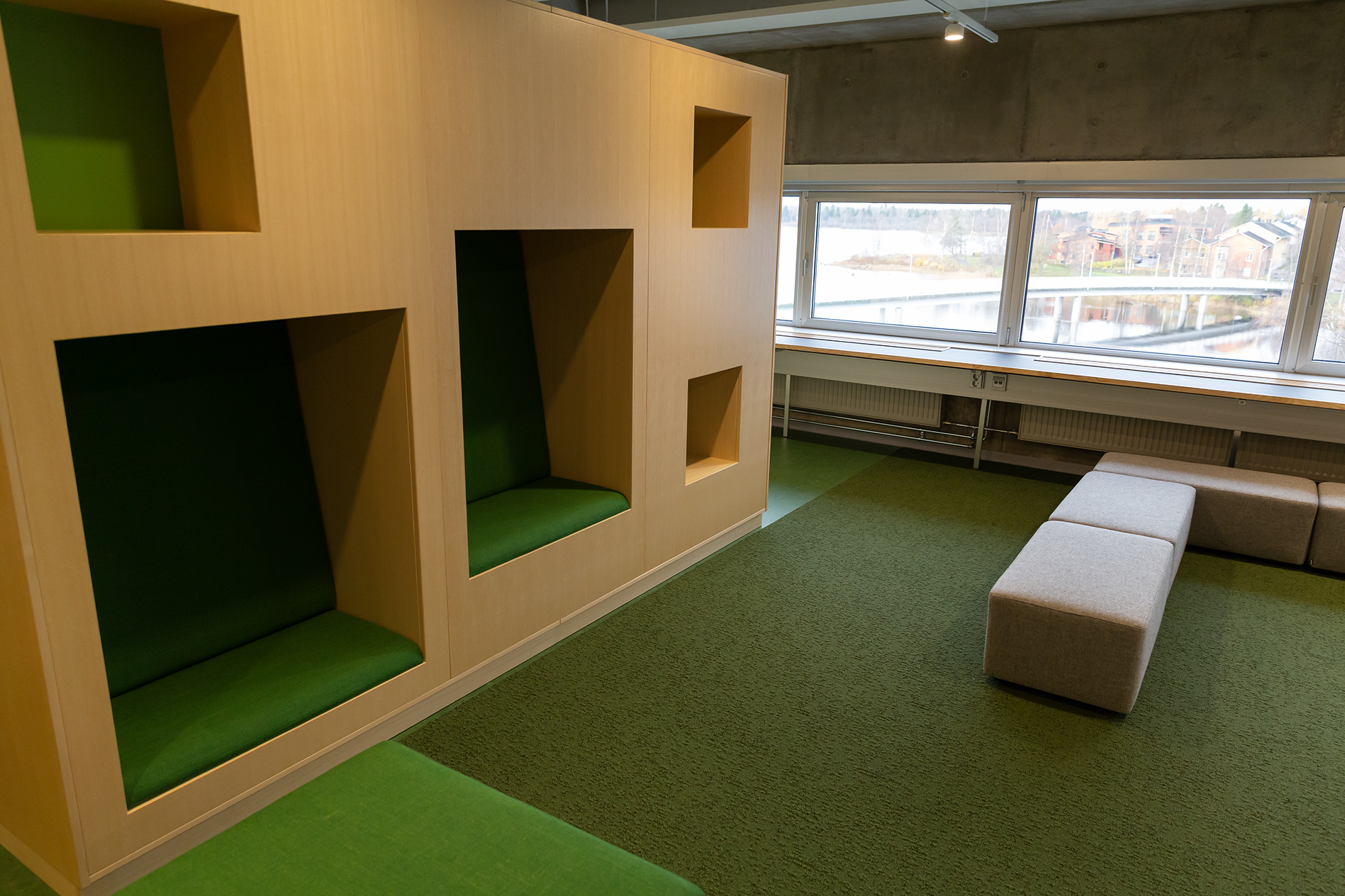 Kirjahyllyissä on käytetty hyväksi lähes kolmen kilometrin mitalta vanhoja, uudelleen viilutettuja hyllylevyjä, vaikka vanhat lastulevystä tehdyt hyllyrungot jouduttiin uusimaan. Vanhoja valaisimia on säilytetty ja kunnostettu, samoin Artekin ja Studio Nurmesniemen alkuperäistä sisustusta ja kalustusta.