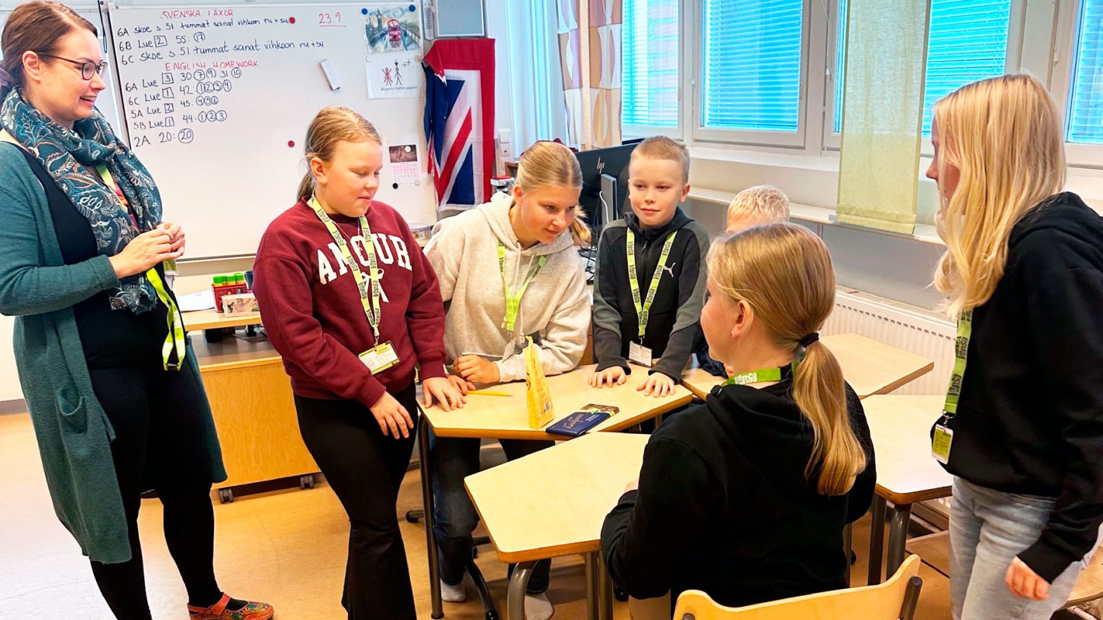 Martinniemen koulun Verso-oppilaat demonstroivat sovittelutoimintaa vierailijoille. Kuvassa vas. erityisopettaja Satu-Maaria Toppinen sekä kasvot kameraan päin: vasemmalta Sinikka Heikkilä (5.lk), Pinja Häkkilä (6.lk) Vertti Puurunen (5.lk) ja Juuso Hyry (5.lk). Edessä vasemmalla Sandra Koivukangas (5.lk) ja Stiina Klasila (6.lk). Kuva: Laura Ansamaa