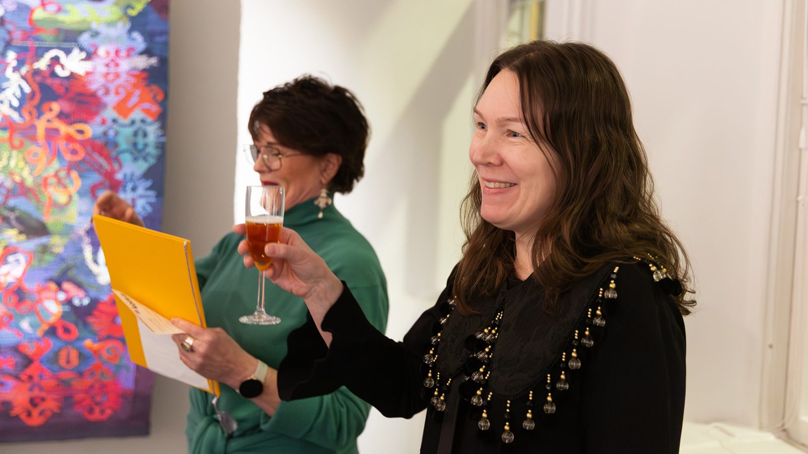 Oulun Taiteilijaseuran puheenjohtaja Johanna Pöykkö skoolasi tiistai-iltana Pohjois-Pohjanmaan ja Kainuun taidepalkinnon kunniaksi. Taustalla palkinnon jakanut alueellisen taidetoimikunnan jäsen Moosa Myllykangas. Kuvat: Pasi Rytinki