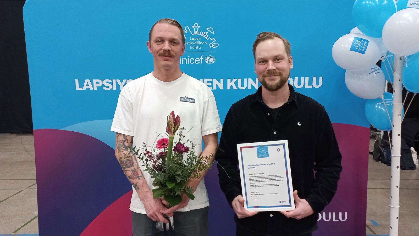 Oulun Rullalautailijat ry:tä edustavat Antti Kontulainen ja Tuukka Korhonen vastaanottivat Oulun kaupunginjohtaja Ari Alatossavalta Oulun lapsiystävällisin teko 2025 -palkinnon Ilon päivä -tapahtumassa Ouluhallissa keskiviikkona. Kuva: Satu Fränti