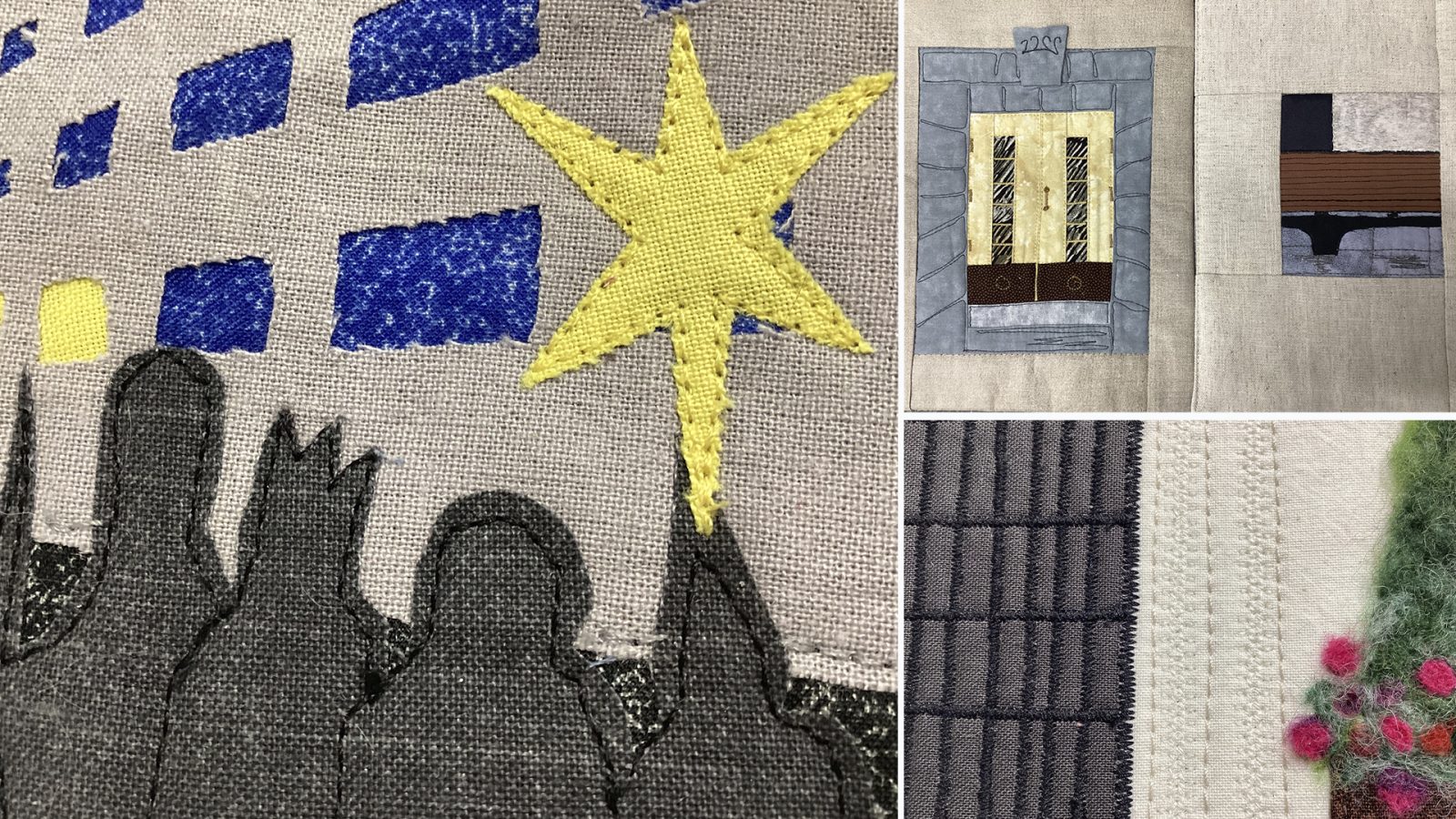 Rotuaarin varrella -haastetyössä on muun muassa Riitta Suorsan, Marita Pääskysen ja Helena Kalliosalon tilkkutöitä. Kuvat: Oulu-opisto